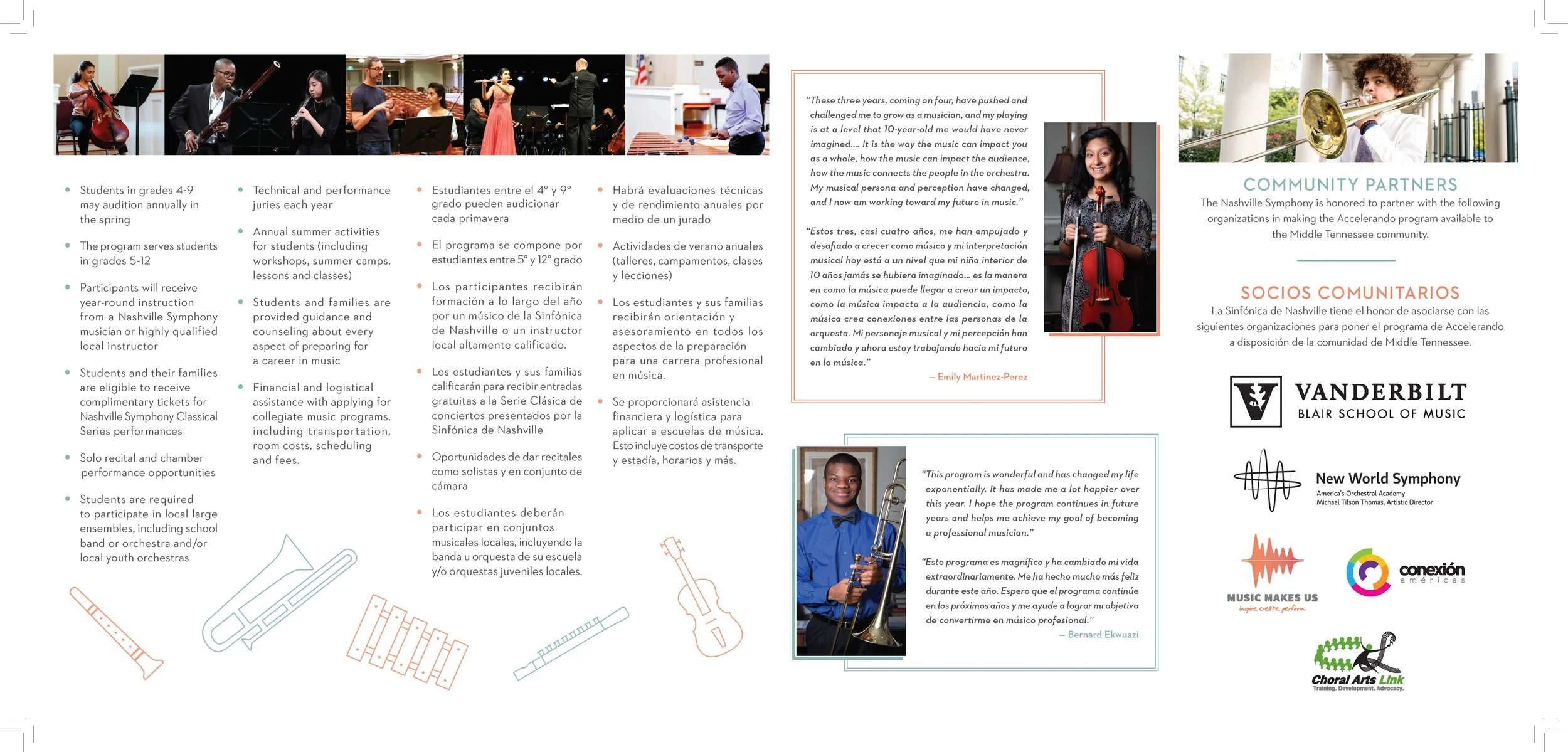 A yearly brochure featuring information on the Nashville Symphony’s Accelerando program. This piece is created in English and Spanish.